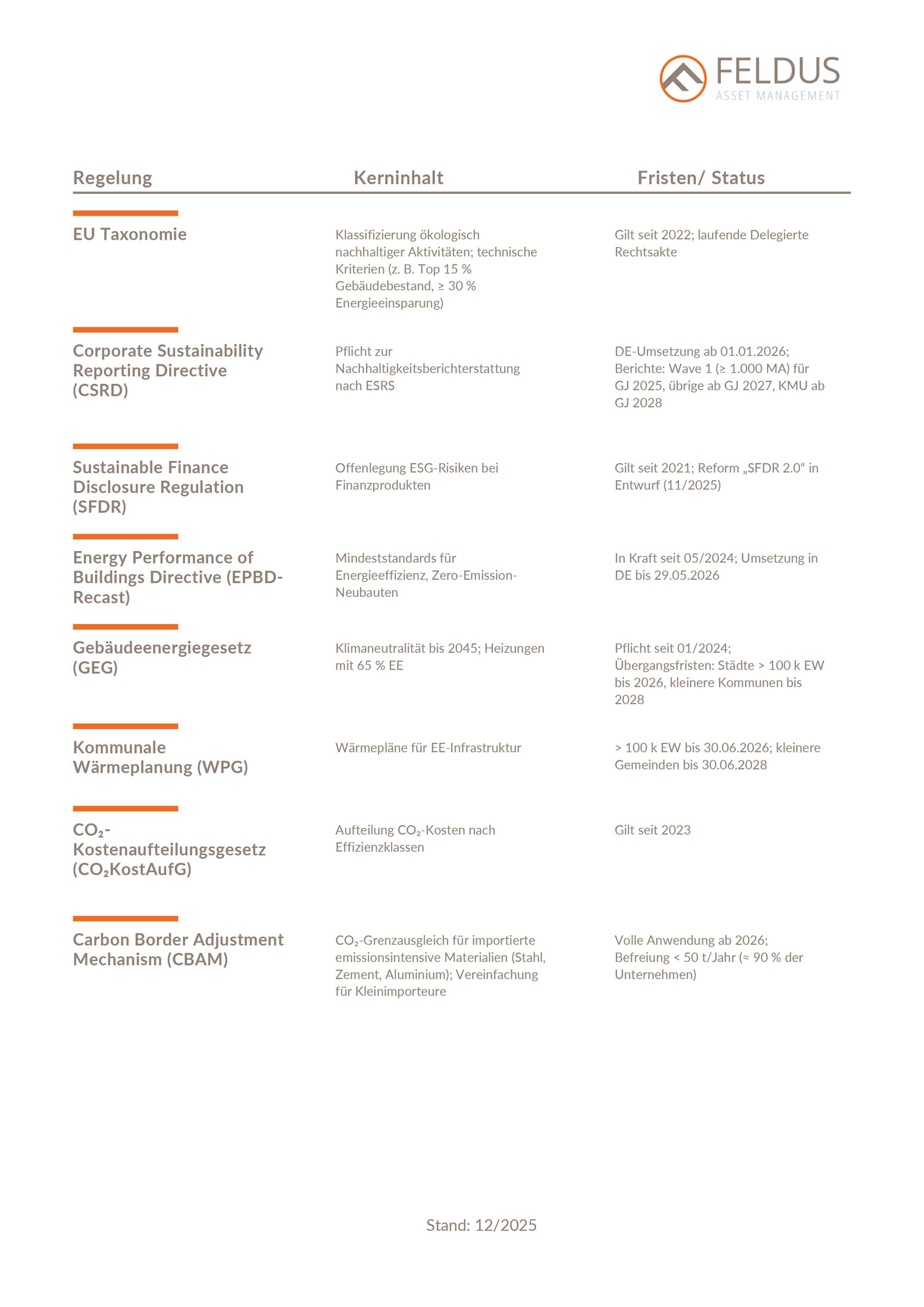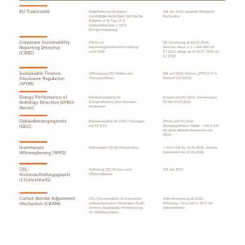 Mantelverordnung: Umfasst die Ersatzbaustoffverordnung (EBV) und die Neufassung der Bundes-Bodenschutzverordnung. Sie ist seit 01.08.2023 in Kraft und regelt bundeseinheitlich den Einsatz von mineralischen Ersatzbaustoffen und den Bodenschutz.8 Für ESG-Strategien ist sie relevant, weil sie die Kreislaufwirtschaft fördert und Anforderungen an Schadstoffprüfung und Dokumentation definiert, welches wichtige Hebel für nachhaltige Sanierung und Rückbau sind.